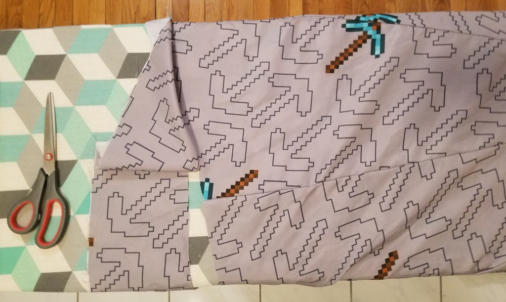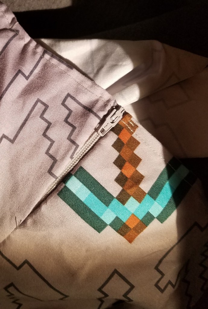 This is a polyester bedsheet that I bought at the Value Village by Eglinton and Victoria Park in September 2021 for $5.49. Official Minecraft merchandise, with the print featuring diamond pickaxes (and outlines of additional, unspecified pickaxes).
