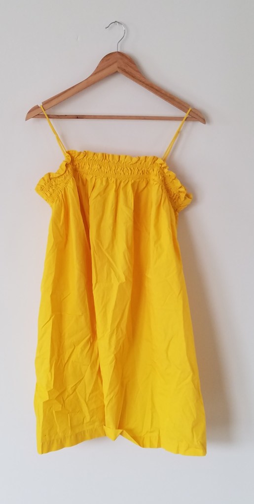 The blog has been on the move! In terms of net displacement, Behold the Thing has relocated from Ontario to Nova Scotia, but in the meantime we scratched the travel itch by running around England for a while (as if trying to imitate Charity Shop Chic even more than we already have). Sewing Machine #1 (2013-2024) did not quite survive all this, so we took it to electronics recycling and waited until our return to buy another machine of the exact same model (Janome Sewist 625E). It must be admitted that in the meantime we did nothing to stop the flow of potential refashion projects into the house. The above, for instance, is a little cotton sundress that I grabbed off a bargain rack at a TKMaxx in the autumn of 2023 for £4. At the time, it was intact and new with tags, but I accidentally deleted the photos I took of it before I detached the gathered skirt. This is why, in the picture above, it’s been hastily safety-pinned back together. (In my defense, the label says ‘Pieces’, but it came with only one of those.) I was able to get the dress on in its default state, but the cut of it is way off relative to my physical dimensions. The vertical span of the bodice is barely adequate, for one thing. For another, my body has a long torso and this dress has none whatsoever. Empire-waisted dresses on me are not a good idea. However, I love the print (pink with diagonal chains of little yellow circles), and the ruffles on the sleeves are wonderful. I’d like to save those. Decision: introduce a second fabric – some bright yellow cotton matching the polka dots – for a new bodice, and maybe also a flounce around the bottom of the skirt as well. Oh yes!