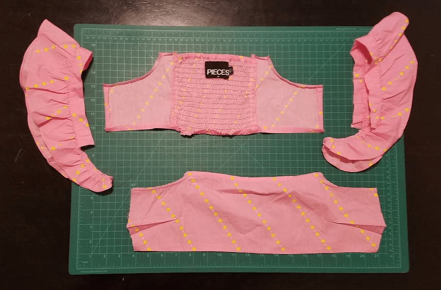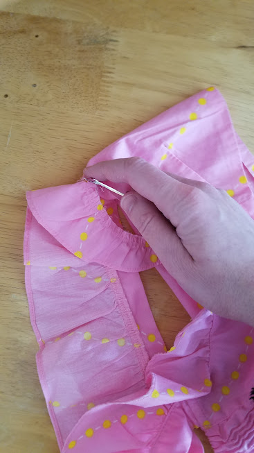 Okay, disassembly time! I leave the ruffles attached to the straps, but remove those from the bodice. Then I take apart the bodice’s little side seams.