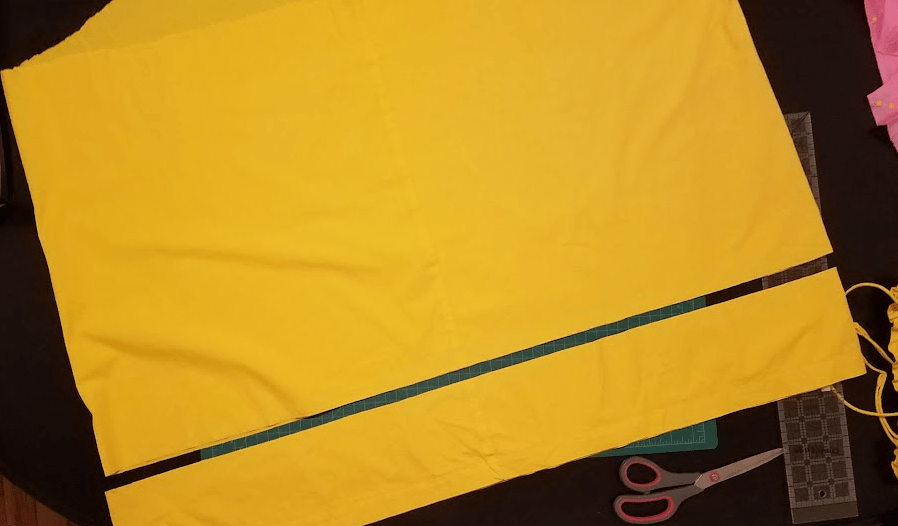 As for the yellow thing, I just cut off the elastic, then iron what turns out to be a truly impressive amount of fabric for a cotton tunic labelled ‘medium’. (To the point that I wonder whether it was meant as pregnancy-wear.) Before I go any further, I decide to carefully cut off the bottom and save it for the flounce. I measure five inches from the hem, then cut.