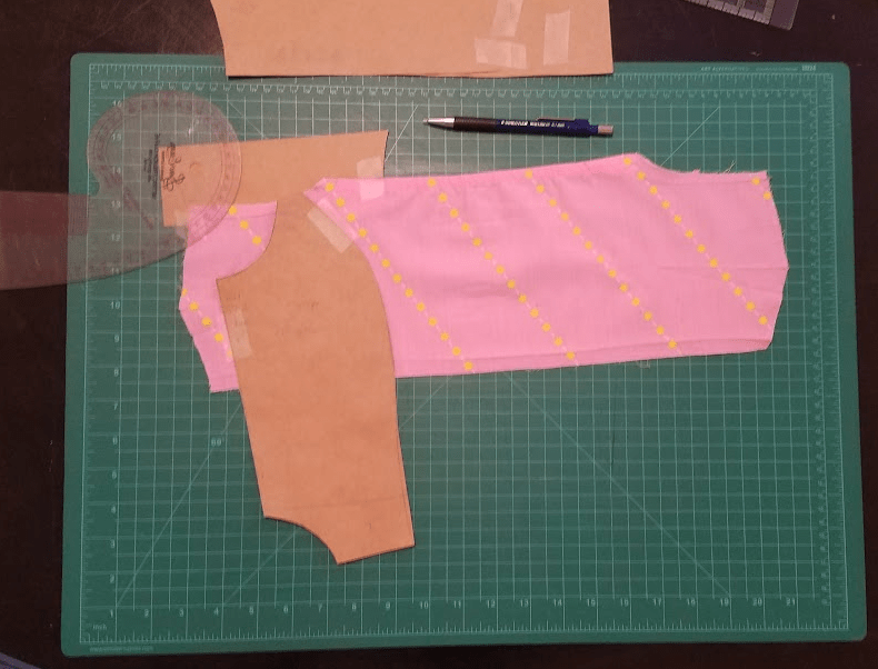 I don’t want to regather the skirt; I’d rather just cut it to be fitted. So I cut the side-seams off, iron the pieces, take some measurements, line the pieces up, and sketch out a maximally flared shape (by leaving the span at the bottom hem as wide as possible).