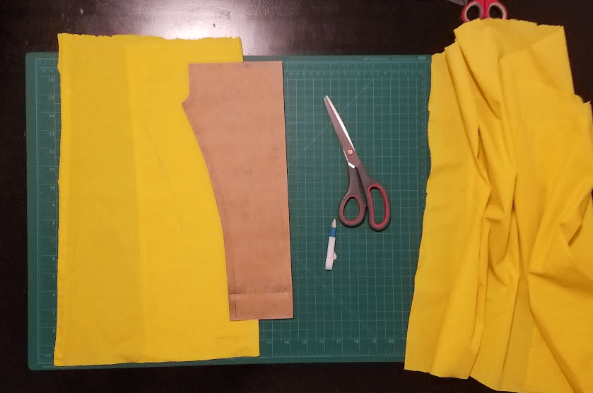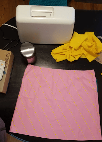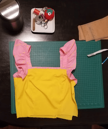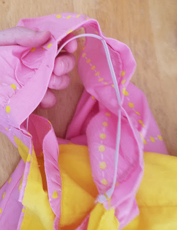 I go to my local fabric store and browse for yellow-ish cottons. Nothing really catches my interest. However, doing the rounds of the charity shops serendipitously yields this thing for £3 at a bargain outlet. It’s some kind of top that I wouldn’t wear like this, but is exactly what I need for the project. It’s just a rectangle of cotton fabric with two lines of elastic at the top. The combination of that and some pink thread (£3) and some yellow thread (£2, because I bought less of it) means we have all the supplies we should need here.