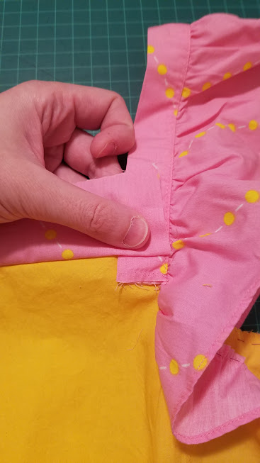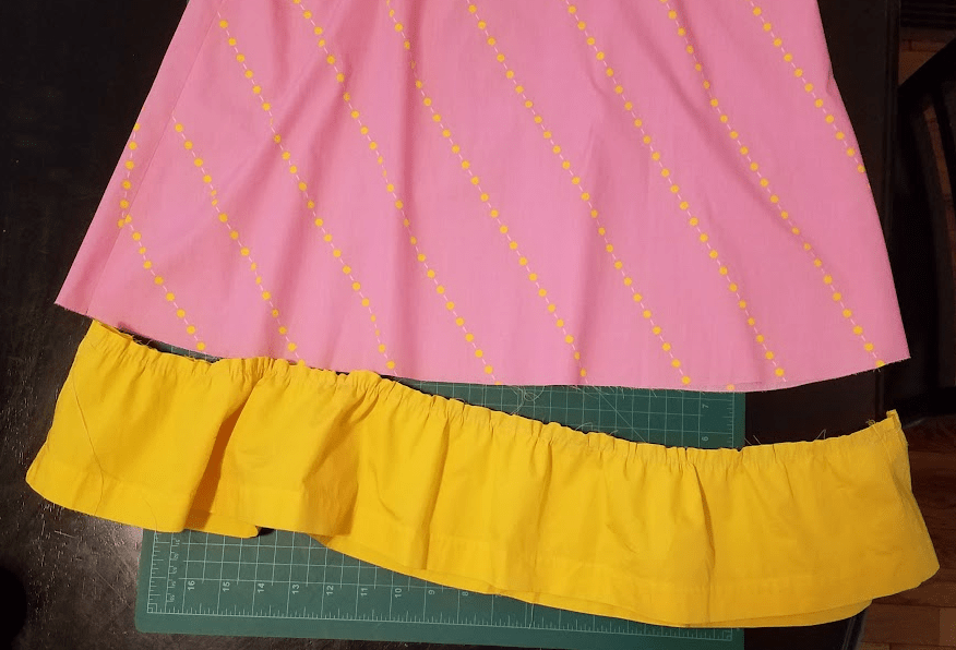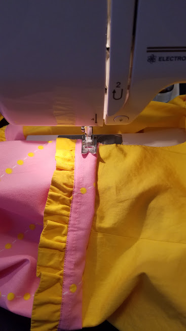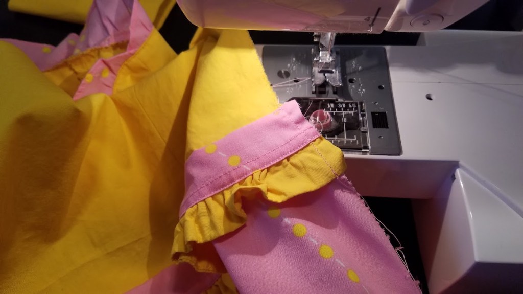 Hmm. I was just going to disregard all this, but I might actually be able to play with it a bit. Let’s see. I cut off the intact yellow ruffle and try attaching it to the bottom of the pink piece. With a 1/16″ seam because there is still an elastic inside the yellow casing barely above the seam-line and I don’t want to catch it by mistake.