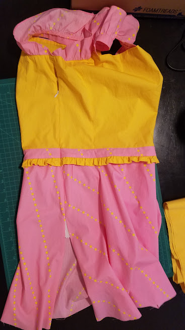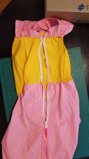 For now, I machine-baste along the top of the skirt twice, gather the skirt a bit, attach the skirt to the waist, and clean up the seams. Then I consider whether to leave the pink strip dangling as above so that I could tie it off in a bow at the left hip. This is a fun idea for sure, but I consider and decide that there are several reasons why I shouldn’t try that. One: most of the strap is about to be sewn directly to the yellow pieces, all the way around. This isn’t going to leave enough room to tie anything. Two, goodness knows how I’d put in the zipper. Oh, and I’d have to hide the wrong side of the strip somehow, which would be a lot of extra work. Okay, no.